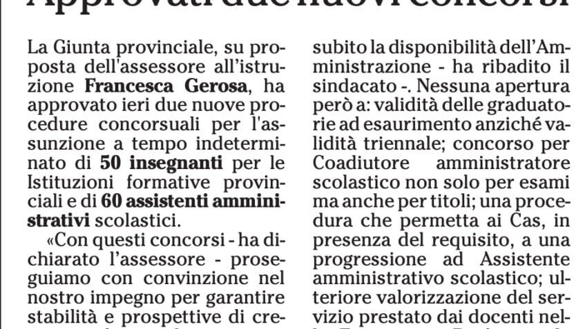 La Giunta provinciale, su proposta dell’assessore all’istruzione Francesca Gerosa, ha approvato ieri due nuove procedure concorsuali per l’assunzione a tempo indeterminato di 50 insegnanti per le Istituzioni formative provinciali e di 60 assistenti amministrativi scolastici. «Con questi concorsi – ha dichiarato l’assessore – proseguiamo con convinzione nel nostro impegno per garantire stabilità e prospettive di crescita professionale». Soddisfazione solo parziale invece per la Uil Scuola Rua: «Sul numero dei posti disponibili abbiamo apprezzato fin da subito la disponibilità dell’Amministrazione – ha ribadito il sindacato -. Nessuna apertura però a: validità delle graduatorie ad esaurimento anziché validità triennale; concorso per Coadiutore amministratore scolastico non solo per esami ma anche per titoli; una procedura che permetta ai Cas, in presenza del requisito, a una progressione ad Assistente amministrativo scolastico; ulteriore valorizzazione del servizio prestato dai docenti nella Formazione Professionale Provinciale e una pubblicazione delle griglie di valutazione prima dello svolgimento delle prove.»