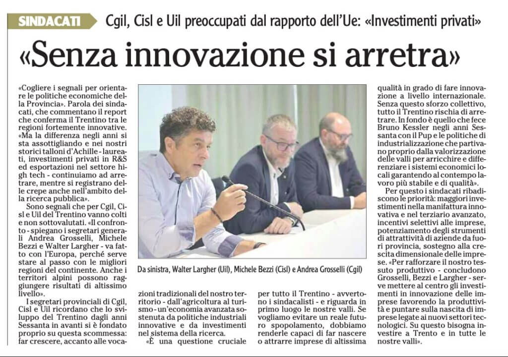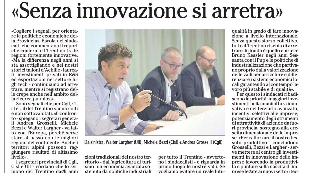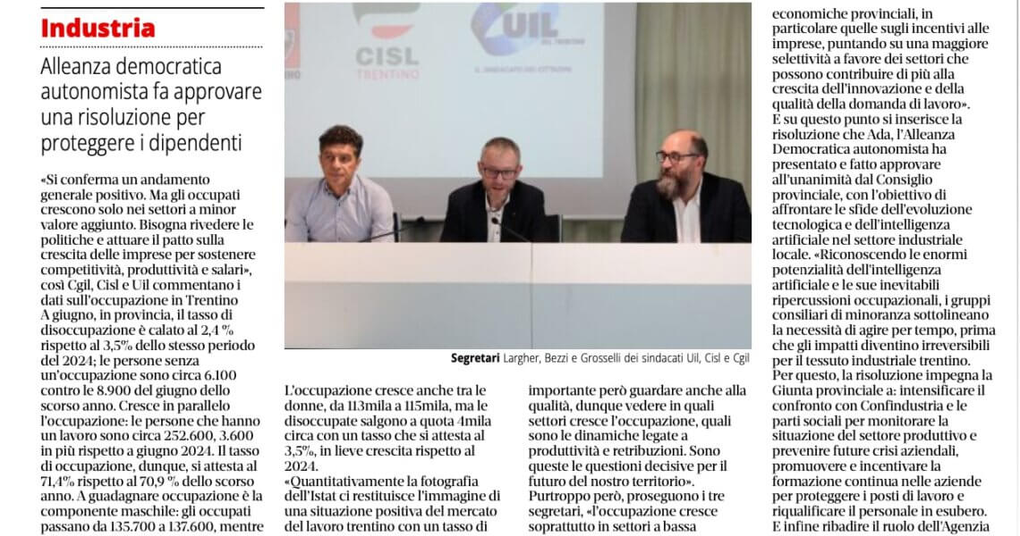 Mercato del Lavoro. In Trentino disoccupazione al 2,4%, meno 1.600 lavoratori nell’industria Sindacati: “Si conferma un andamento generale positivo. Ma gli occupati crescono solo nei settori a minor valore aggiunto. Rivedere le politiche e attuare il patto sulla crescita delle ...