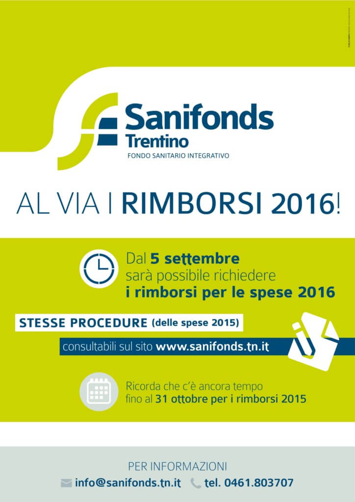 Sanifonds – AL VIA I RIMBORSI 2016! A partire da lunedì 5 settembre, sarà possibile richiedere i rimborsi al Fondo Sanitario integrativo Sanifonds Trentino anche per l’anno 2016. La procedura per la presentazione della pratica 2016 è la medesima predisposta ...