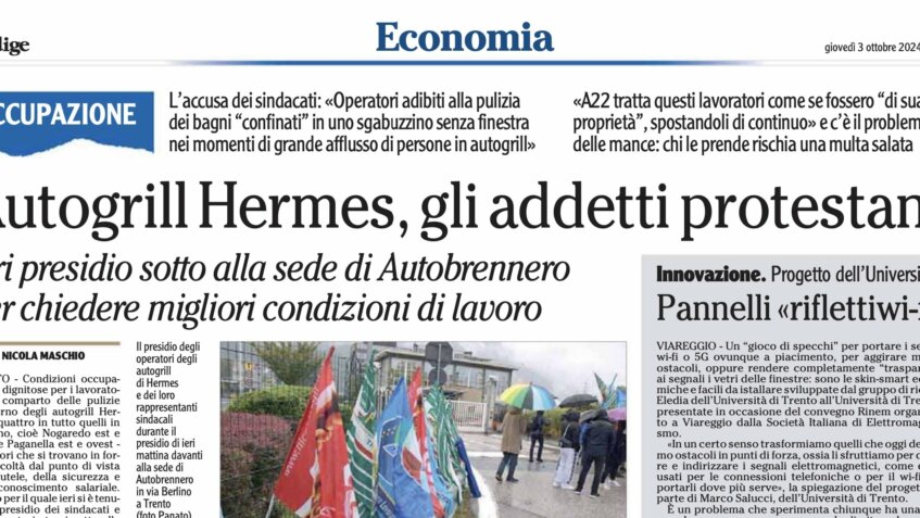 TRENTO — Condizioni occupazionali dignitose per i lavoratori del comparto delle pulizie all’interno degli autogrill Hermes – quattro in tutto quelli in Trentino, cioè Nogaredo est e ovest e Paganella est e ovest – operatori che si trovano in forte difficoltà dal punto di vista delle tutele, della sicurezza e del riconoscimento salariale. Motivo per il quale ieri si è tenuto un presidio dei sindacati e dei lavoratori stessi sotto alla sede di A22 (ricordiamo che Hermes è la società appaltatrice mentre Autostrada del Brennero quella appaltante), con l’intento di ribadire i punti principali sui quali l’azienda deve intervenire con rapidità. Anche perché altrimenti, hanno sottolineato le forze sindacali, a questa prima manifestazione ne seguiranno sicuramente altre.