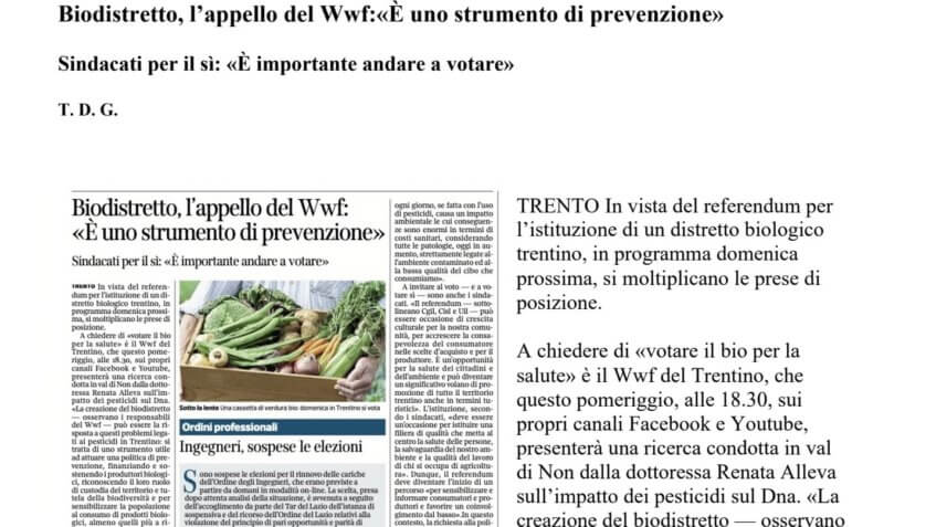 A chiedere di «votare il bio per la salute» è il Wwf del Trentino, che questo pomeriggio, alle 18.30, sui propri canali Facebook e Youtube, presenterà una ricerca condotta in val di Non dalla dottoressa Renata Alleva sull’impatto dei pesticidi sul Dna. «La creazione del biodistretto — osservano i responsabili del Wwf — può essere la risposta a questi problemi legati ai pesticidi in Trentino: si tratta di uno strumento utile ad attuare una politica di prevenzione, finanziando e sostenendo i produttori biologici, riconoscendo il loro ruolo di custodia del territorio e tutela della biodiversità e per sensibilizzare la popolazione al consumo di prodotti biologici, almeno quelli più a rischio di presenza residuale di pesticidi (non solo mele, ma anche fragole, pesche albicocche, cavolfiori)». E ancora: «La presenza del biodistretto sarà utile a far crescere la consapevolezza che la produzione del cibo che consumiamo ogni giorno, se fatta con l’uso di pesticidi, causa un impatto ambientale le cui conseguenze sono enormi in termini di costi sanitari, considerando tutte le patologie, oggi in aumento, strettamente legate all’ambiente contaminato ed alla bassa qualità del cibo che consumiamo».