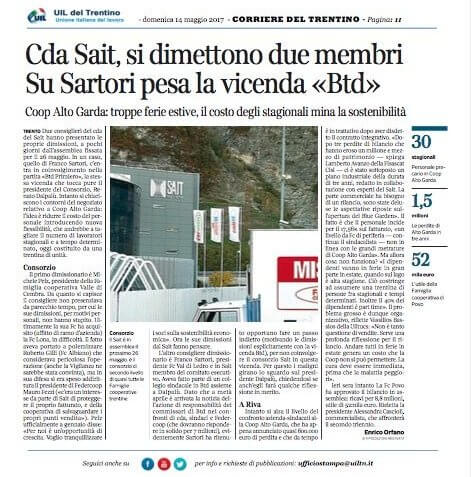 Due consiglieri del cda del Sait hanno presentato le proprie dimissioni, a pochi giorni dall’assemblea fissata per il 26 maggio. In un caso, quello di Franco Sartori, c’entra in coinvolgimento nella partita «Btd Primiero», la stessa vicenda che tocca pure il presidente del Consorzio, Renato Dalpalù. Intanto si chiariscono i contorni del negoziato relativo a Coop Alto Garda: l’idea è ridurre il costo del personale introducendo nuova flessibilità, che andrebbe a tagliare il numero di lavoratori stagionali e a tempo determinato, oggi costituito da una trentina di unità.