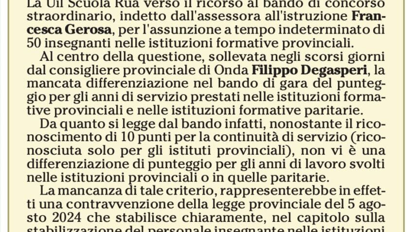 La Uil Scuola Rua verso il ricorso al bando di concorso straordinario, indetto dall’assessora all’istruzione Francesca Gerosa, per l’assunzione a tempo indeterminato di 50 insegnanti nelle istituzioni formative provinciali.