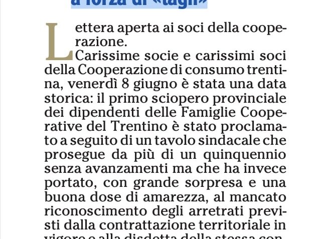 Carissime socie e carissimi soci della Cooperazione di consumo trentina, venerdì 8 giugno è stata una data storica: il primo sciopero provinciale dei dipendenti delle Famiglie Cooperative del Trentino è stato proclamato a seguito di un tavolo sindacale che prosegue da più di un quinquennio senza avanzamenti ma che ha invece portato, con grande sorpresa e una buona dose di amarezza, al mancato riconoscimento degli arretrati previsti dalla contrattazione territoriale in vigore e alla disdetta della stessa contrattazione dal 1° luglio 2023 (quasi 2.000 euro netti annui in meno).
