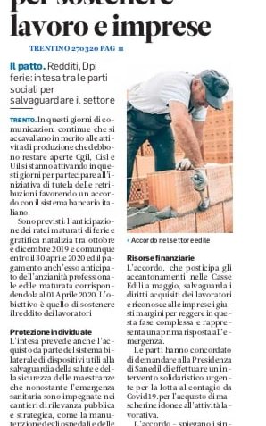 L’accordo, che posticipa gli accantonamenti nelle Casse Edili a maggio, salvaguarda i diritti acquisiti dei lavoratori e riconosce alle imprese i giusti margini per reggere in questa fase complessa e rappresenta una prima risposta all’emergenza.
