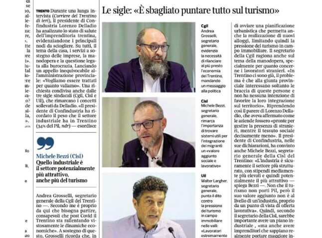 Il presidente di Confindustria, nelle sue dichiarazioni, ha convinto anche Michele Bezzi, segretario generale della Cisl del Trentino: «L’industria è sicuramente il settore più strutturato, con stipendi mediamente più elevati e quindi potenzialmente il più attrattivo — spiega Bezzi —. Non che il turismo non porti Pil, però il suo valore aggiunto non è al livello di un’industria, proprio da un punto di vista di offerta lavorativa». Quindi, secondo il segretario della Cisl, sarebbe importante avere un piano industriale, «ma anche avere imprenditori che sappiano realmente portare maggiore innovazione». «E questi — ribadisce — credo che sia giusto vengano valorizzati e aiutati nel loro progresso».