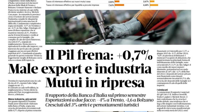 Un semestre a crescita contenuta, sia per la provincia di Trento che per quella di Bolzano, in cui la parola chiave è incertezza e gli investimenti restano deboli. Questo il quadro che emerge dal rapporto sulla congiuntura curato dalla Banca d’Italia e presentato ieri dai nuovi direttori delle filiali di Trento e Bolzano, Gennaro Sansone e Stefano Francescon, insieme al capo della divisione analisi e ricerca, Michele Cascarano. In entrambe le province cresce il settore dei servizi mentre l’industria, complici le dinamiche internazionali, sconta una fase di difficoltà. L’andamento complessivo segna un tiepido +0,7% in Trentino e un +0,5% in Alto Adige. Fisiologico il tasso di disoccupazione che si mantiene intorno al 2%. Positivo anche il trend di mutui e crediti al consumo per le famiglie, che complice il calo dei tassi d’interesse, ora sotto il 4%, segnala un miglioramento. Stenta invece a riprendersi il credito alle imprese, con interessi che per le piccole aziende viaggiano ancora su tassi effettivi superiori al 6%. Guardando al quadro generale, in questo semestre Trento fa leggermente meglio di Bolzano con la sola eccezione dell’export: in Trentino le esportazioni sono in calo di circa il 4%, mentre l’Alto Adige viaggia su un +1%. Il contrario accade nell’edilizia, in miglioramento a Trento dietro la spinta del Pnrr, in peggioramento invece a Bolzano.