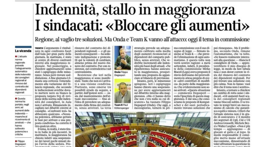 Intanto, però, le minoranze spingono. Ieri i capigruppo hanno chiesto una sospensione per avere aggiornamenti sul dibattito interno alla maggioranza. «Ma ci hanno detto che non c’era nulla su cui discutere» ha tuonato Filippo Degasperi (Onda). Che oggi, a mezzogiorno, tornerà in prima commissione con il suo disegno di legge — firmato insieme al Team K — che prevede l’eliminazione di ogni automatismo. E questa volta non vorrà sentire ragioni: a metà settembre, infatti, il presidente della commissione Mirko Bisesti (Lega) aveva proposto il rinvio dell’esame del provvedimento in attesa proprio di avere «altri contributi di modifica» da parte della maggioranza. Che evidentemente non sono arrivati. «Questa situazione — commenta Degasperi — svela l’ipocrisia di questa maggioranza. È dal 2014 che conosciamo le proposte di Kompatscher e dei suoi: periodicamente trovano soluzioni che poi rinnegano». Ma il problema, secondo Onda, rimane l’automatismo, che va tolto. «Se fossero realmente interessati alla questione — rilancia il consigliere di Onda — approverebbero il mio disegno di legge, in modo da fare tabula rasa e non dover correre in vista del rinnovo del contratto dei dipendenti regionali. Per poi trovare una soluzione con più calma. Non lo fanno: vuol dire che il tema non è sentito».