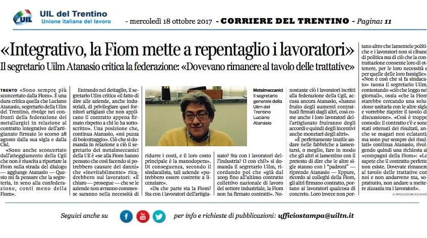 «Sono sempre più sconcertato dalla Fiom». È una dura critica quella che Luciano Atanasio, segretario della Uilm del Trentino, rivolge nei confronti della federazione dei metallurgici in relazione al contratto integrativo dell’artigianato firmato lo scorso 28 agosto dalla sua sigla e dalla Cisl.