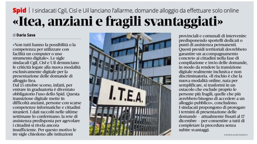 TRENTO «Non tutti hanno la possibilità o la competenza per utilizzare con facilità un computer o uno strumento digitale». Le sigle sindacali Cgil, Cisl e Uil denunciano le criticità legate alla nuova modalità esclusivamente digitale per la presentazione delle domande di alloggio Itea. Dal 15 ottobre scorso, infatti, per entrare in graduatoria è diventato obbligatorio l’uso dello Spid. Questa transizione digitale mette in difficoltà anziani, persone con scarse competenze informatiche e cittadini stranieri. I dati raccolti nelle ultime settimane lo confermano: la rete di assistenza predisposta per agevolare i cittadini si rivela ancora insufficiente. Per questo motivo le tre sigle chiedono alle istituzioni provinciali e comunali di intervenire predisponendo sportelli dedicati o punti di assistenza permanenti. Questi presidi territoriali dovrebbero garantire un accompagnamento concreto ai cittadini nella fase di compilazione e invio delle domande, in modo da rendere la transizione digitale realmente inclusiva e non discriminatoria. «Il rischio è che la nuova modalità online, nata per semplificare, si trasformi in un ostacolo che esclude proprio le persone più fragili, quelle che più avrebbero bisogno di accedere a un alloggio pubblico», concludono. I sindacati propongono di prorogare i termini di presentazione delle domande – attualmente fissati al 17 dicembre – per consentire a tutti di completare la procedura senza subire svantaggi.