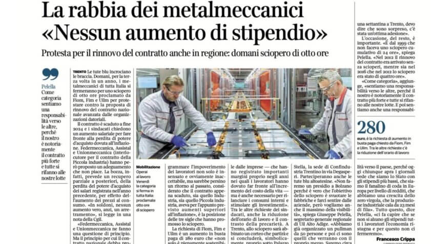 La richiesta di Fiom, Fim e Uilm è un aumento in busta paga di 280 euro che «non solo è pienamente sostenibile dalle imprese — che hanno registrato importanti margini proprio negli anni nei quali i lavoratori hanno dovuto far fronte all’incremento del costo della vita — ma è anche necessario per rilanciare i consumi interni e stimolare gli investimenti». Tra le altre richieste dei sindacati, anche la riduzione dell’orario di lavoro e il contrasto della precarietà. A Trento, allo sciopero sarà abbinato un corteo che partirà e si concluderà, simbolicamente, proprio sotto Palazzo Stella, la sede di Confindustria Trentino in via Degasperi. Parteciperanno anche le tute blu altoatesine. «Non faremo un presidio a Bolzano perché è vero che l’obiettivo dello sciopero è svuotare le fabbriche e farci sentire dalle aziende, però vogliamo anche il massimo della visibilità», spiega Giuseppe Pelella, segretario generale regionale di Uil Alto Adige. «Abbiamo già organizzato un pullman da 50 persone e poi ci sono quelli che verranno con il proprio mezzo. Saremo circa una settantina a Trento, devo dire che sono sorpreso, c’è stata un’ottima adesione».