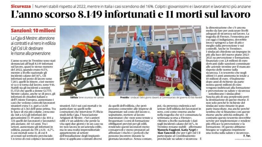 L’anno scorso in Trentino sono stati denunciati all’Inail 8.149 infortuni sul lavoro, quasi lo stesso numero del 2022, quando erano 8.174, mentre a livello nazionale gli incidenti calano del 16%. Gli infortuni sul posto di lavoro sono 7.203, quelli in itinere, cioè mentre si va o si torna dal lavoro, sono 946. Stabili sia gli incidenti a uomini (5.372) che quelli a donne (2.777). Mentre calano, anche se di poco, gli infortuni di cittadini italiani o dell’Unione Europea, aumentano i casi che vedono coinvolti lavoratori stranieri extra Ue, pari a 1.630 rispetto ai 1.561 dell’anno prima. Tra le fasce di età più colpite, crescono da 568 a 632 gli infortuni dei giovanissimi 15-19 anni e da 404 a 431 quelli dei lavoratori e lavoratrici più anziane, 60-64 anni. Tra i settori, aumentano gli infortuni in edilizia, passati da 591 a 631: +6,7%. I casi mortali sono 11, di cui 8 avvenuti sul territorio provinciale. Un terzo di essi colpisce lavoratori stranieri. Ed è sui casi mortali e in particolare su quelli nelle costruzioni che interviene l’Uff icio studi della Cgia, l’Associazione Artigiani di Mestre. «Nei cantieri edili c’è un addetto che perde la vita ogni due giorni e in un caso su tre non lavora in un’azienda edile, ma in una realtà imprenditoriale appartenente al settore dell’installazione degli impianti» dove si applicano contratti diversi da quelli dell’edilizia, che però possono consentire alle imprese di risparmiare sul costo del lavoro e, soprattutto, mettere al lavoro maestranze che «non sono tenute a frequentare i corsi di formazione obbligatori previsti per gli edili, rendendo questi lavoratori meno consapevoli e meno preparati ad affrontare i rischi e i pericoli che possono incorrere durante la giornata lavorativa». Senza contare, poi, «la presenza endemica nel settore dell’edilizia dei lavoratori in nero, così come emerso anche nella tragedia che si è consumata la settimana scorsa a Firenze». «Mentre a livello nazionale i dati sugli incidenti calano del 16%, in Trentino restano stabili – affermano Manuela Faggioni, Katia Negri e Alan Tancredi che per Cgil Cisl Uil partecipano al Coordinamento provinciale su salute e sicurezza – È la dimostrazione che c’è ancora molto da fare per assicurare livelli adeguati di sicurezza sul lavoro. La tragedia di Firenze, l’ennesima per cui oggi ci indigniamo, dovrebbe invece spingerci a fare di più e meglio sulla prevenzione e sui controlli. Anche in Trentino».