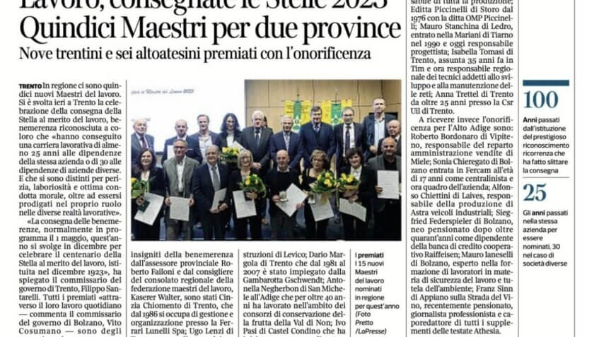 «La consegna delle benemerenze, normalmente in programma il 1 maggio, quest’anno si svolge in dicembre per celebrare il centenario della Stella al merito del lavoro, istituita nel dicembre 1923», ha spiegato il commissario del governo di Trento, Filippo Santarelli. Tutti i premiati «attraverso il loro lavoro quotidiano — commenta il commissario del governo di Bolzano, Vito Cosumano — sono degli esempi per le nuove generazioni». Per il Trentino, a essere insigniti della benemerenza dall’assessore provinciale Roberto Failoni e dal consigliere del consolato regionale della federazione maestri del lavoro, Kaserer Walter, sono stati Cinzia Chiomento di Trento, che dal 1986 si occupa di gestione e organizzazione presso la Ferrari Lunelli Spa; Ugo Lenzi di Torcegno, coordinatore dei capicantiere per la Libardoni Costruzioni di Levico; Dario Margola di Trento che dal 1981 al 2007 è stato impiegato dalla Gambarotta Gschwendt; Antonella Negherbon di San Michele all’Adige che per oltre 40 anni ha lavorato nell’ambito dei consorzi di conservazione della frutta della Val di Non; Ivo Pasi di Castel Condino che ha iniziato come apprendista tornitore nel 1980 per la Vi-Da di Storo diventando poi responsabile di tutta la produzione; Editta Piccinelli di Storo dal 1976 con la ditta OMP Piccinelli; Mauro Stanchina di Ledro, entrato nella Mariani di Tiarno nel 1990 e oggi responsabile progettista; Isabella Tomasi di Trento, assunta 35 anni fa in Tim e ora responsabile regionale dei tecnici addetti allo sviluppo e alla manutenzione delle reti; Anna Trettel di Trento da oltre 25 anni presso la Csr Uil di Trento.