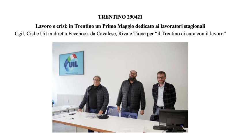 Lavoro e crisi: in Trentino un Primo Maggio dedicato ai lavoratori stagionali. Cgil, Cisl e Uil in diretta Facebook da Cavalese, Riva e Tione per “il Trentino ci cura con il lavoro”