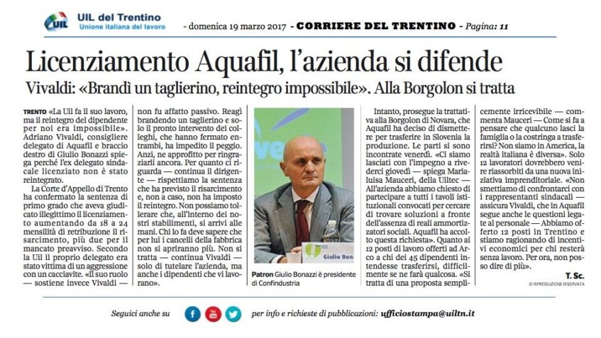 «La Uil fa il suo lavoro, ma il reintegro del dipendente per noi era impossibile». Adriano Vivaldi, consigliere delegato di Aquafil e braccio destro di Giulio Bonazzi spiega perché l’ex delegato sindacale licenziato non è stato reintegrato.