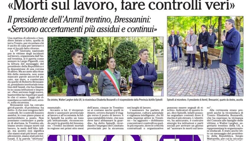 Una mattina di silenzio e bandiere listate a lutto, quella di ieri a Trento, per ricordare chi è uscito di casa per lavorare e non vi ha più fatto ritorno. La 75ª Giornata nazionale per le vittime degli incidenti sul lavoro, organizzata dall’Anmil trentina, si è aperta come sempre in Largo Pigarelli, con la lettura del messaggio del presidente della Repubblica e la deposizione di una corona di alloro. Ma accanto alla ritualità della memoria, non sono mancate parole ancorché pacate, ma dure, a cominciare da quelle di Roberto Bressanini, presidente territoriale trentino dell’Anmil, che ha chiamato in causa istituzioni e imprese: «Non servono leggi nuove, basterebbe far rispettare quelle che ci sono». Leggi che rimandano a controlli veri, severi, sulla sicurezza.