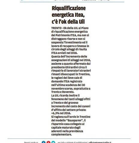 TRENTO – Ok della UIL al Piano di riqualificazione energetica del Patrimonio ITEA, ma non si distraggano risorse e non si sospenda l’investimento ed il lavoro di recupero e rimessa in circolo degli alloggi di risulta ITEA avviati nel 1016.