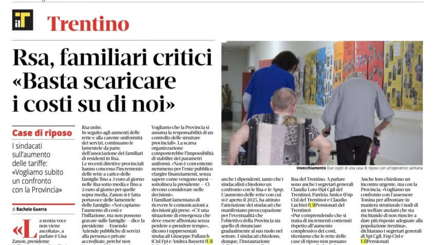 Anche loro chiedono un incontro urgente, ma con la Provincia. «Vogliamo un confronto con l’assessore Tonina per affrontare in maniera strutturale i nodi di un welfare anziani che sta rischiando di non riuscire a dare più risposte adeguate alla popolazione trentina», dichiarano i segretari generali di Spi Cgil, Fnp Cisl e Uil Pensionati.