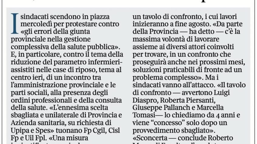I sindacati scendono in piazza mercoledì per protestare contro «gli errori della giunta provinciale nella gestione complessiva della salute pubblica». E, in particolare, contro il tema della riduzione del parametro infermieri-assistiti nelle case di riposo, tema al centro ieri, di un incontro tra l’amministrazione provinciale e le parti sociali, alla presenza degli ordini professionali e della consulta della salute. «L’ennesima scelta sbagliata e unilaterale di Provincia e Azienda sanitaria, su richiesta di Upipa e Spes» tuonano Fp Cgil, Cisl Fp e Uil Fpl. «Una misura ingiustificata e pericolosa» aggiunge la Fenalt. L’assessora Stefania Segnana, durante l’incontro di ieri, ha annunciato l’apertura di un tavolo di confronto, i cui lavori inizieranno a fine agosto. «Da parte della Provincia — ha detto — c’è la massima volontà di lavorare assieme ai diversi attori coinvolti per trovare, in un confronto che proseguirà anche nei prossimi mesi, soluzioni praticabili di fronte ad un problema complesso». Ma i sindacati vanno all’attacco. «Il tavolo di confronto — avvertono Luigi Diaspro, Roberta Piersanti, Giuseppe Pallanch e Marcella Tomasi— lo chiediamo da 4 anni e viene “concesso” solo dopo un provvedimento sbagliato». «Sconcerta — conclude Roberto Moser di Fenalt — l’assoluta mancanza di trasparenza dell’amministrazione».