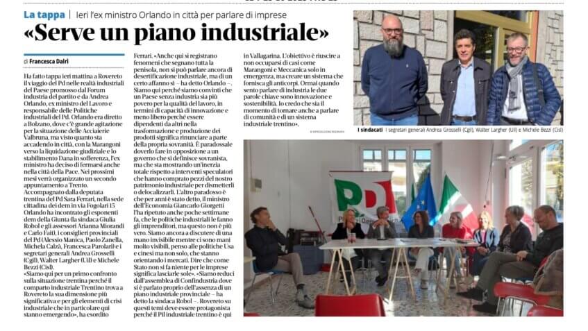 Ha fatto tappa ieri mattina a Rovereto il viaggio del Pd nelle realtà industriali del Paese promosso dal Forum industria del partito e da Andrea Orlando, ex ministro del Lavoro e responsabile delle Politiche industriali del Pd. Orlando era diretto a Bolzano, dove c’è grande agitazione per la situazione delle Acciaierie Valbruna, ma visto quanto sta accadendo in città, con la Marangoni verso la liquidazione giudiziale e lo stabilimento Dana in sofferenza, l’ex ministro ha deciso di fermarsi anche nella città della Pace. Nei prossimi mesi verrà organizzato un secondo appuntamento a Trento. Accompagnato dalla deputata trentina del Pd Sara Ferrari, nella sede cittadina dei dem in via Fogolari 15 Orlando ha incontrato gli esponenti dem della Giunta (la sindaca Giulia Robol e gli assessori Arianna Miorandi e Carlo Fait), i consiglieri provinciali del Pd (Alessio Manica, Paolo Zanella, Michela Calzà, Francesca Parolari) e i segretari generali Andrea Grosselli (Cgil), Walter Largher (Uil) e Michele Bezzi (Cisl).