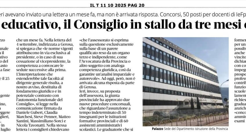 Sono passati tre mesi e mezzo dalle dimissioni di Giulia Bortolotti, consigliera comunale di Trento (Onda), e da allora il Consiglio del sistema educativo provinciale è rimasto orfano del presidente. E, di fatto, è rimasto inoperativo, entrando in una fase di stallo. Le dimissioni erano arrivate il 25 giugno in polemica con l’assessora all’istruzione Francesca Gerosa. Nelle settimane successive la dirigente generale del Dipartimento istruzione, Francesca Mussino, aveva convocato una nuova seduta del Consiglio per eleggere il nuovo presidente. I consiglieri, però, si sono subito opposti, ribadendo la loro posizione in due diverse occasioni, sia a luglio che un mese fa. Nella lettera del 4 settembre, indirizzata a Gerosa, si spiegava che «le norme vigenti attribuiscono in via esclusiva al presidente, o in caso di sua cessazione al vicepresidente, la competenza a convocare le sedute successive alla prima. L’interpretazione che estenderebbe tale facoltà al dirigente generale risulta, a nostro avviso, destituita di fondamento giuridico e in potenziale contrasto con l’autonomia funzionale del Consiglio», si legge nella comunicazione firmata da Daniele Gubert, Claudia Marchesi, Steve Penner, Matteo Santini, Massimiliano Sorci e Nicola Tavonatti. Nella stessa lettera i consiglieri chiedevano «che l’assessorato si esprima sulla questione esclusivamente sulla base di un parere qualificato reso da un organo terzo e indipendente, come l’Avvocatura della Provincia o altro soggetto con analoga competenza giuridica, così da garantire un’analisi imparziale e autorevole». Ad oggi, però, non è arrivata alcuna risposta da parte di Gerosa. Ieri, invece, su proposta dell’assessora, la giunta provinciale ha approvato due nuove procedure concorsuali, che riguardano l’assunzione a tempo indeterminato di 50 insegnanti per le istituzioni formative provinciali e di 60 assistenti amministrativi scolastici. Le graduatorie che si formeranno resteranno valide per un triennio, in modo che sia possibile conferire incarichi anche a candidati idonei non vincitori. «Con questi concorsi — dichiara Gerosa — proseguiamo con convinzione nel nostro impegno per garantire stabilità e prospettive di crescita professionale a chi ogni giorno contribuisce al buon funzionamento delle nostre scuole». La Uil Scuola, però, lamenta la chiusura rispetto alle richieste su «validità delle graduatorie ad esaurimento anziché validità triennale» e sul «concorso per Cas (coadiutore amministrativo) non solo per esami ma anche per titoli».