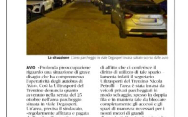 AVIO «Profonda preoccupazione riguardo una situazione di grave disagio che ha compromesso l’operatività degli autobus di Avio». Così la Uiltrasporti del Trentino denuncia quanto avvenuto nella serata del 25 ottobre nell’area parcheggio situata in viale Degasperi. Un’area, precisa il sindacato, «regolarmente affittata e pagata da Trentino Trasporti per garantire un’adeguata area di sosta e manovra per i mezzi adibiti al trasporto di persone». Ma che sabato sera, invece di essere lasciata libera per le corriere, è stata invasa dalle auto parcheggiate in maniera selvaggia in ogni spazio libero. Una situazione non solo di disagio ma che ha compromesso anche la possibilità di manovra dei mezzi di Trentino Trasporti. «Nonostante il regolare contratto di affitto che ci conferisce il diritto di utilizzo di tale spazio – lamenta infatti il segretario Uiltrasporti del Trentino Nicola Petrolli – l’area è stata invasa da veicoli privati parcheggiati in modo selvaggio, spesso in doppia fila o in maniera tale da bloccare completamente gli accessi e gli spazi di manovra necessari per i nostri mezzi di grandi dimensioni. Questa situazione ha messo a rischio la sicurezza degli operatori costretti a manovre pericolose o a operare in spazi ristretti. Chiediamo pertanto – conclude la nota diffusa da Petrolli – che il Comune di Avio, nella sua veste di garante della pubblica sicurezza e della corretta gestione del territorio, si adoperi affinché non si verifichi più una situazione come quella di sabato sera».