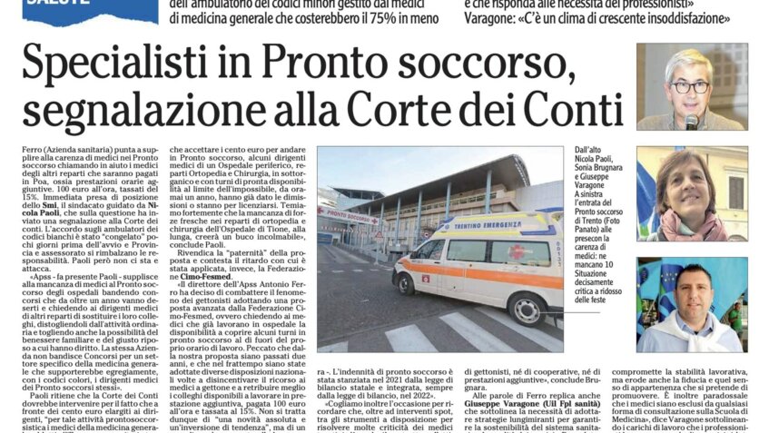 Ferro (Azienda sanitaria) punta a supplire alla carenza di medici nei Pronto soccorso chiamando in aiuto i medici degli altri reparti che saranno pagati in Poa, ossia prestazioni orarie aggiuntive. 100 euro all’ora, tassati del 15%. Immediata presa di posizione dello Smi, il sindacato guidato da Nicola Paoli, che sulla questione ha inviato una segnalazione alla Corte dei conti. L’accordo sugli ambulatori dei codici bianchi è stato “congelato” pochi giorni prima dell’avvio e Provincia e assessorato si rimbalzano le responsabilità. Paoli però non ci sta e attacca.