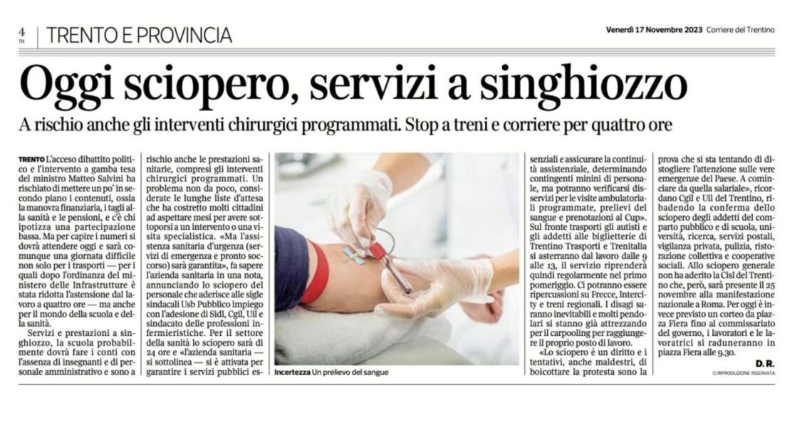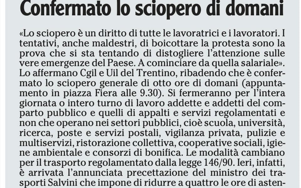 Per i salari e per i diritti. Il 17 e il 24 novembre sciopero generale in Trentino. La mobilitazione è indetta a livello nazionale da Cgil e Uil. Questo venerdì assemblea di delegate e delegati al Teatro San Marco La ...