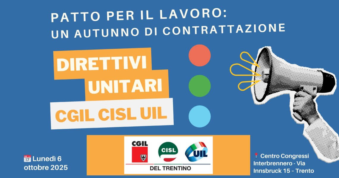 Patto per il lavoro: un autunno di contrattazione Lunedì 6 ottobre 2025, dalle ore 09.00 alle 13.00, presso il Centro Congressi Interbrennero di Trento (Via Innsbruck 15), si terrà l’incontro dei Direttivi unitari CGIL CISL UIL del Trentino. Una mattinata ...