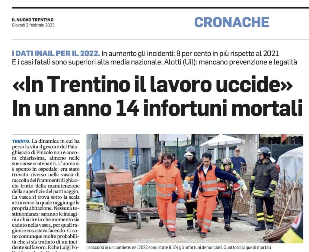 Il primo morto sul lavoro del 2023 in Trentino a Pinzolo. Proprio oggi i dati 2022, tragici, dell’INAIL. “Aumentano gli infortuni sul lavoro”. Il Segretario Alotti: “Assicurare prevenzione e legalità” Comunicato stampa UIL Trentino del 1 febbraio 2023 E’ morto ...