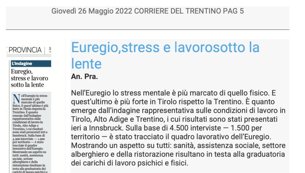 Condizioni di lavoro nell’Euroregio. L’indagine diventi strutturale. I sindacati rivendicano l’utilità di un’analisi che anche in futuro potrà fornire elementi importanti per pianificare strategie utili a gestire i cambiamenti che impatteranno sull’occupazione Rendere strutturale l’indagine sulle condizioni di lavoro nell’Euregio. ...