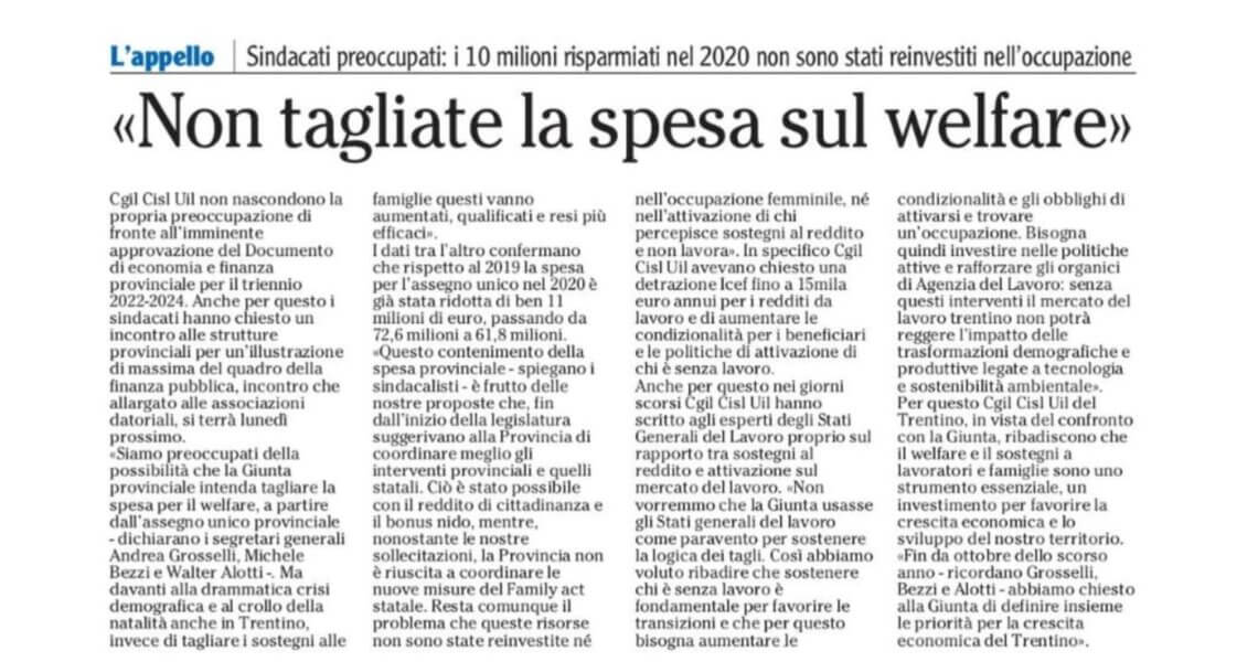 Assegno universale. Da oggi le domande per almeno 3mila famiglie trentine Il monito dei sindacati: la giunta faccia ogni sforzo perché sia coordinata con la misura provinciale se non vogliamo far risparmiare lo Stato con i soldi dei trentini ...