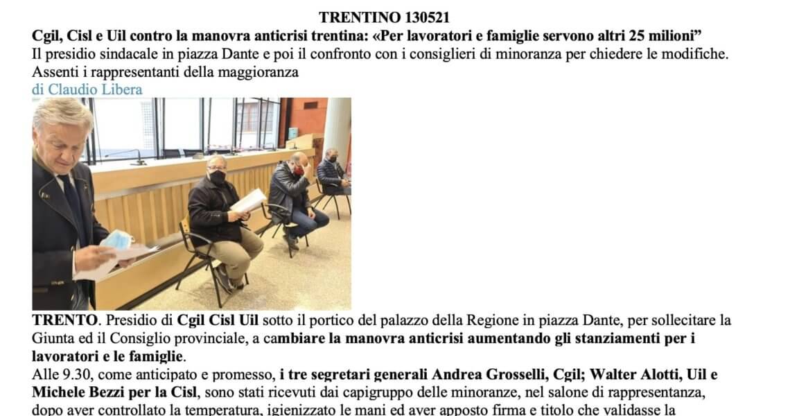 manovra provinciale anticrisi – presidio unitario mercoledì 12 maggio ore 9 in piazza Dante La Giunta provinciale nelle settimane scorse ha presentato un disegno di legge con misure anticrisi che anticipano di fatto l’assestamento di bilancio. Le nostre organizzazioni unitariamente ...