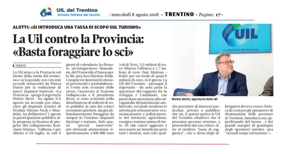 COMUNICATO STAMPA UIL TRENTINO DEL 7/8/2018 Finanziamenti del turismo a pioggia: 8 milioni di euro in 8 giorni! La UIL: il prossimo governo provinciale introduca “la tassa di scopo sul turismo”. La Provincia Autonoma di Trento, capitanata dall’Assessore Dallapiccola ...