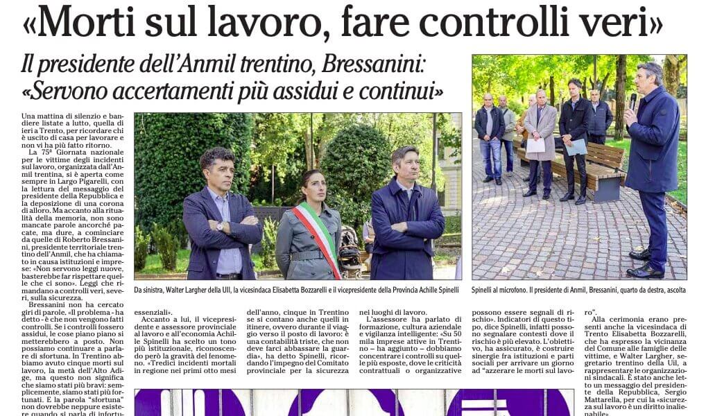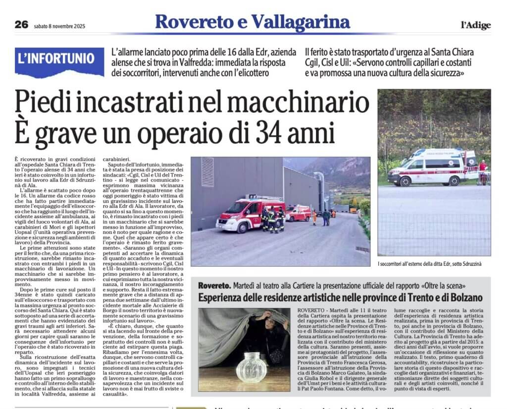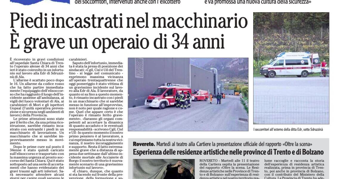 Morte sul lavoro. Il cordoglio di Cgil Cisl Uil “L’ennesima tragedia sul lavoro ha colpito oggi il Trenrino. Un ragazzo di soli 25 anni, cittadino moldavo e residente a Padova, ha perso la vita mentre lavorava presso la ditta Cmv. ...