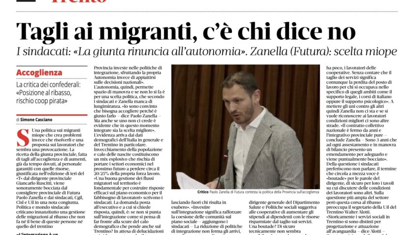 Una politica sui migranti miope che crea problemi invece che risolverli e una proposta sui lavoratori che sembra una provocazione. La ricetta della giunta provinciale, fatta di tagli all’accoglienza e di aumenti, già da tempo dovuti, al personale garantiti con quelle risorse, giustificata nell’edizione di ieri del «T» dal dirigente provinciale Giancarlo Ruscitti, viene sonoramente bocciata dal consigliere provinciale di Futura Paolo Zanella e dai sindacati, Cgil, Cisl e Uil in una nota congiunta. Politica e mondo sindacale criticano innanzitutto una gestione delle migrazioni al ribasso che non fa né il bene di queste persone né quello del trentino