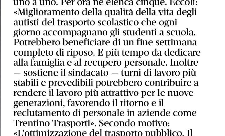 Per ora ne elenca cinque. Eccoli: «Miglioramento della qualità della vita degli autisti del trasporto scolastico che ogni giorno accompagnano gli studenti a scuola. Potrebbero beneficiare di un fine settimana completo di riposo. E più tempo da dedicare alla famiglia e al recupero personale. Inoltre — sostiene il sindacato — turni di lavoro più stabili e prevedibili potrebbero contribuire a rendere il lavoro più attrattivo per le nuove generazioni, favorendo il ritorno e il reclutamento di personale in aziende come Trentino Trasporti». Secondo motivo: «L’ottimizzazione del trasporto pubblico. Il sabato, molti mezzi di trasporto circolano semivuoti a causa della parziale chiusura delle scuole. È sufficiente che solo alcune scuole rimangano aperte per dover mantenere in funzione il servizio, con un enorme dispendio di risorse». E poi, la «riduzione dell’inquinamento», perché «in un periodo in cui si parla sempre più di sostenibilità ambientale, ha poco senso far circolare autobus, treni e pullman con uno o due studenti a bordo». La soluzione? «Eliminare la giornata scolastica del sabato contribuirebbe a ridurre le emissioni inutili, in linea con gli obiettivi green». Altro punto, altro motivo: «Risparmio energetico e costi di gestione, perché tenere aperta una scuola per un solo giorno in più a settimana comporta spese significative, in particolare per il riscaldamento, la luce e la pulizia». E per ultimo, in sintesi, «eliminare le lezioni del sabato non è solo una scelta educativa, ma anche economica e ambientale».