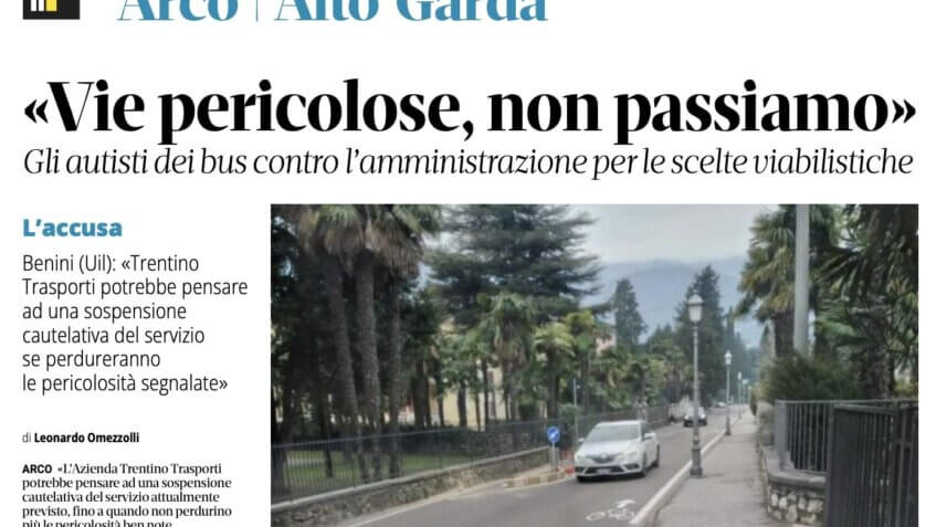 ARCO «L’Azienda Trentino Trasporti potrebbe pensare ad una sospensione cautelativa del servizio attualmente previsto, fino a quando non perdurino più le pericolosità ben note all’amministrazione di Arco». Non ci gira nemmeno troppo attorno il delegato sindacale Uil Trasporti, Alberto Benini, che dopo aver sollecitato l’amministrazione arcense a intervenire per sistemare alcune tratte stradali che rendono le manovre dei bus pericolose (tra questi i pinch point e alcune altre vie che hanno avuto recenti modifiche strutturali ndr) si sfoga pubblicamente per sottolineare l’inadempienza amministrativa che non ha ancora dato risposte agli autisti a oltre 116 giorni dall’ultima commissione.